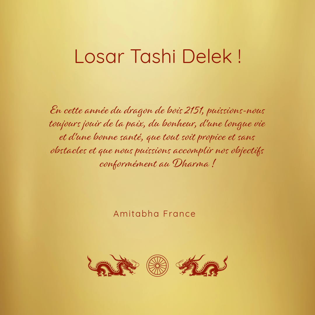 En cette année du dragon de bois 2151, puissions-nous toujours jouir de la paix, du bonheur, d'une longue vie et d'une bonne santé, que tout soit propice et sans obstacles et que nous puissions accomplir nos objectifs conformément au Dharma !