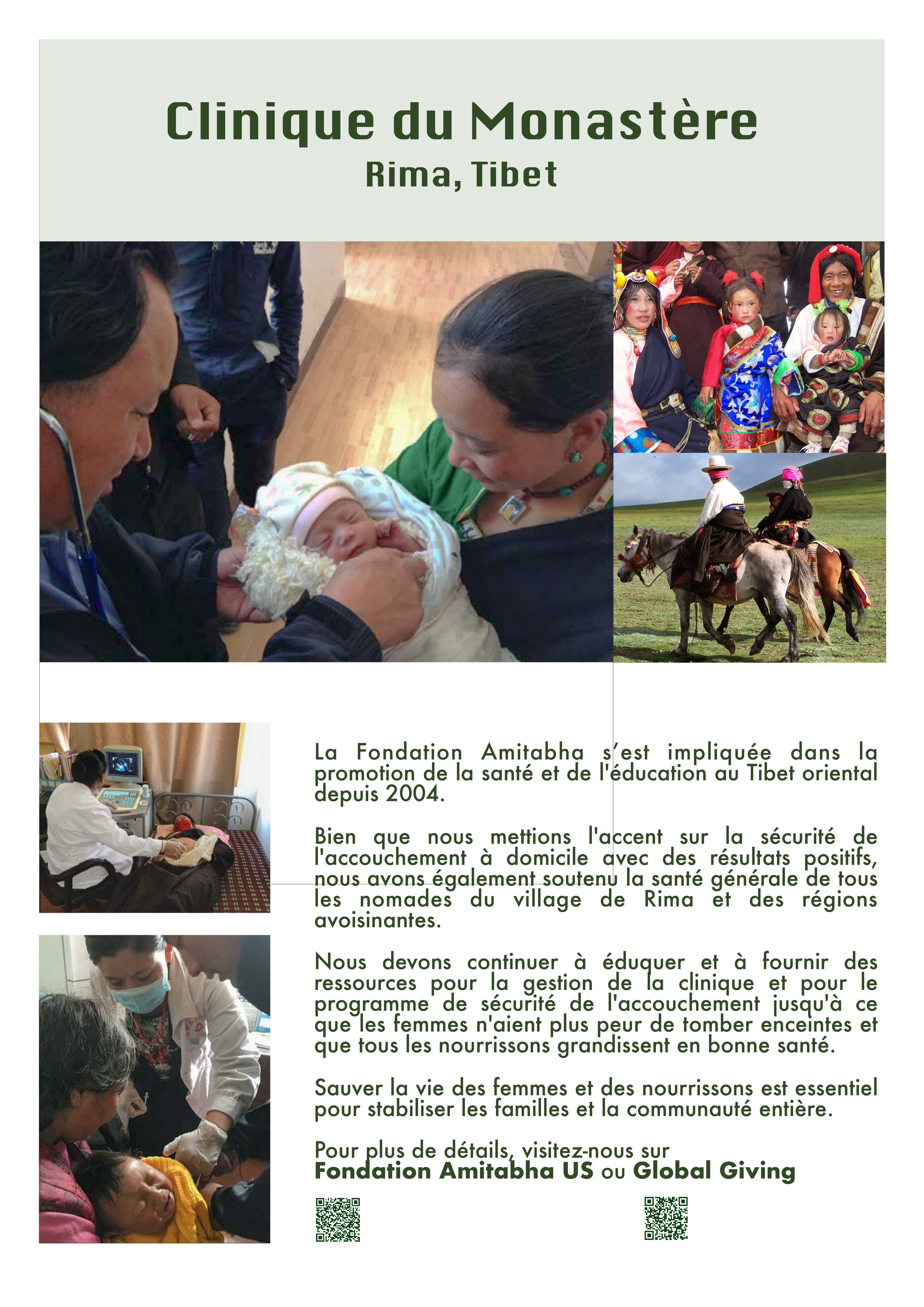 Au cours des dernières années, « Amitabha Foundation » a mis en place le réseau «un Cœur» pour la sécurité sanitaire dans le village de Rima et dans d’autres villages de collectivités du Haut Rashu au Tibet oriental. La fondation a formé 4 personnes qui ont, à leur tour, formé 15 éducateurs de santé publique. Ces jeunes Tibétains et Tibétaines relayent les instructions du «Réseau de Sécurité sanitaire» aux femmes enceintes et à leurs familles, et distribuent des kits de naissance propres afin de promouvoir l’accouchement à la maison à moindre risque. En 2012, le Chef du Projet Tibétain, Dayang, a voyagé de Jyekundo (Yushu) à Chengdu pour y recevoir une formation supplémentaire, en complément de celle donnée par les dirigeants de «One-Heart Worldwide».