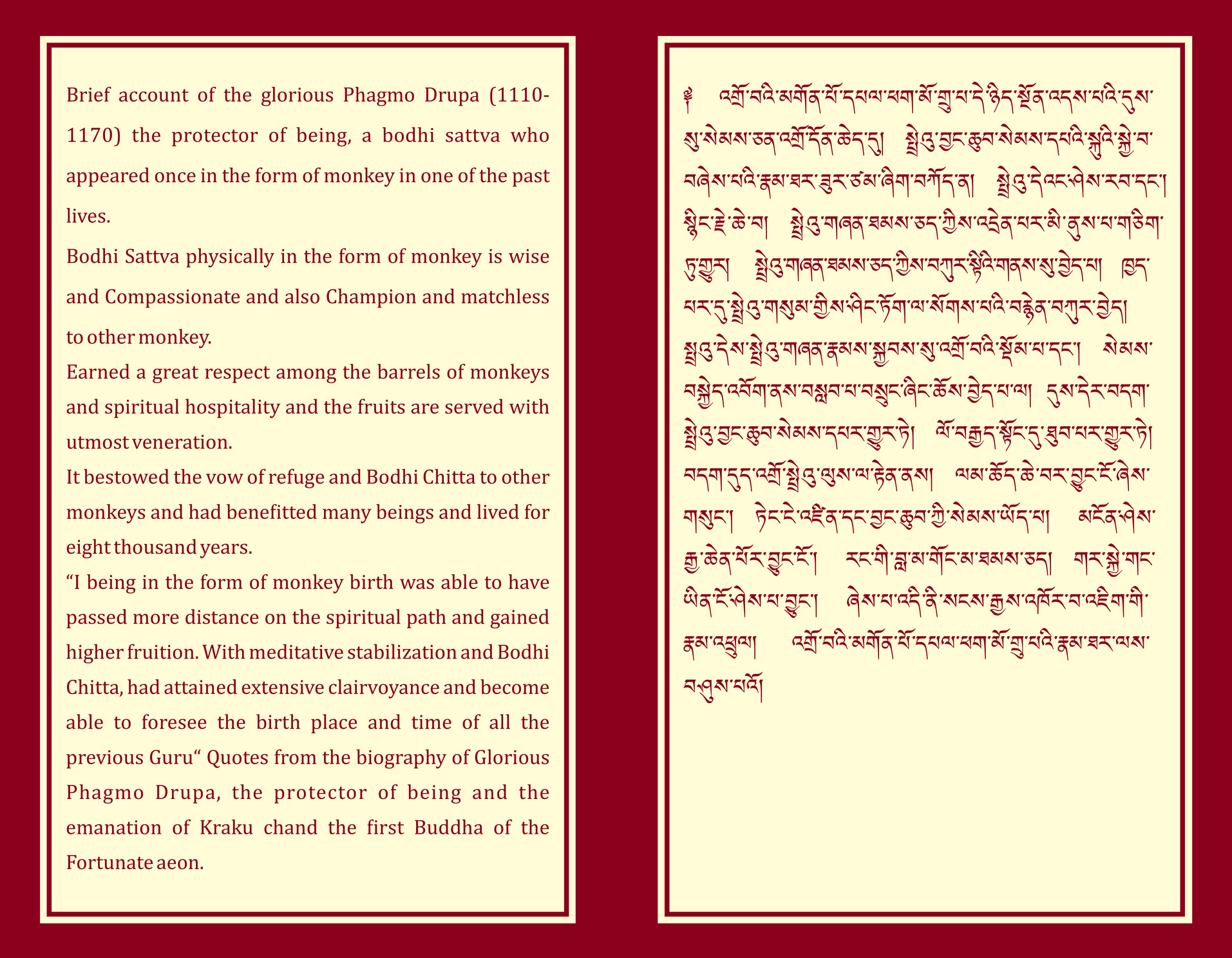 Récit bref sur le glorieux Phagmo Drupa (1110-1170), protecteur des êtres, bodhisattva qui est apparu une fois sous la forme d’un singe lors de l'une de ses vies passées.