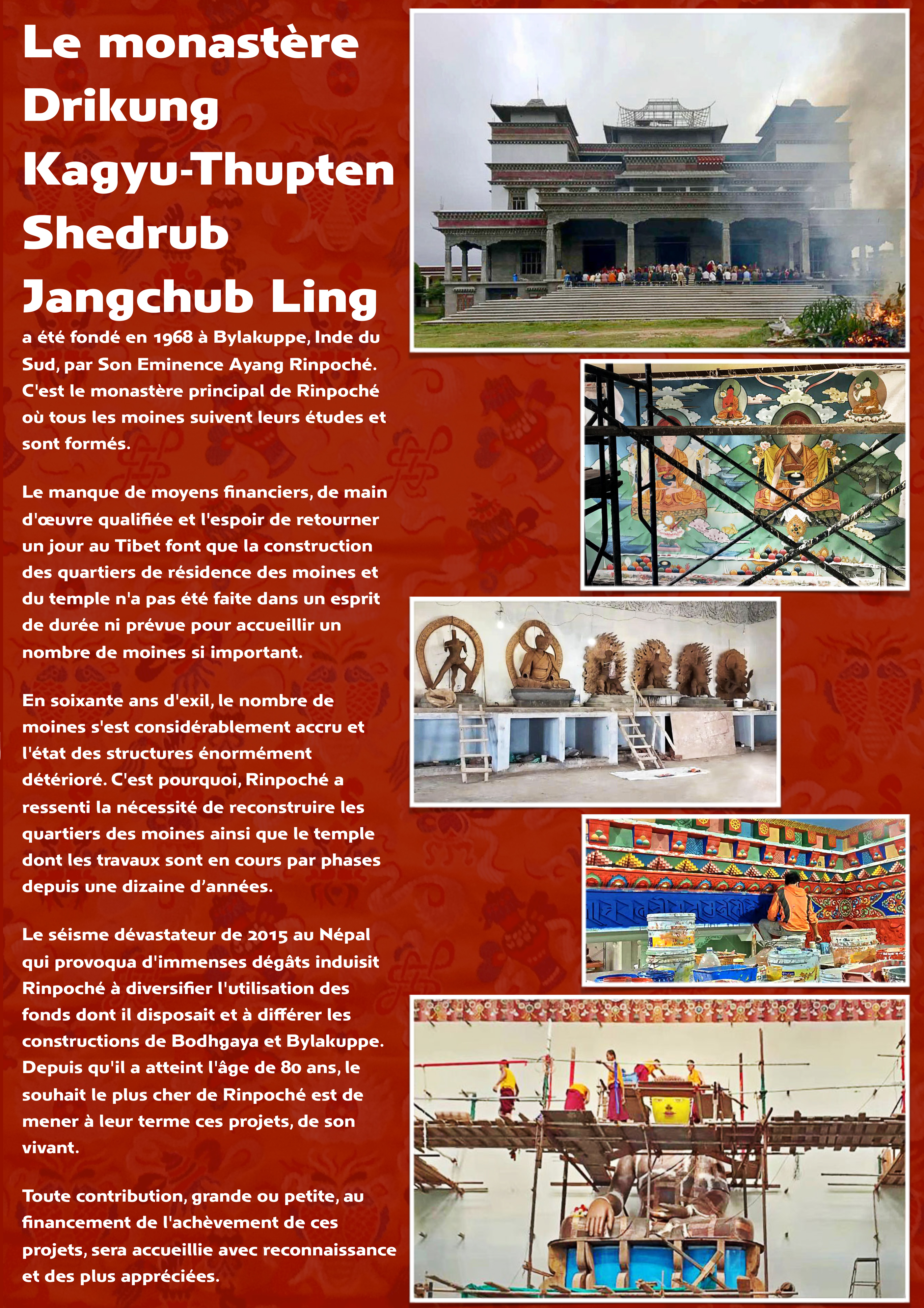 Le monastère Drikung Kagyu-Thupten Shedrub Jangchub Ling a été fondé en 1968 à Bylakuppe, Inde du Sud, par Son Eminence Ayang Rinpoché. C'est le monastère principal de Rinpoché où tous les moines suivent leurs études et sont formés.