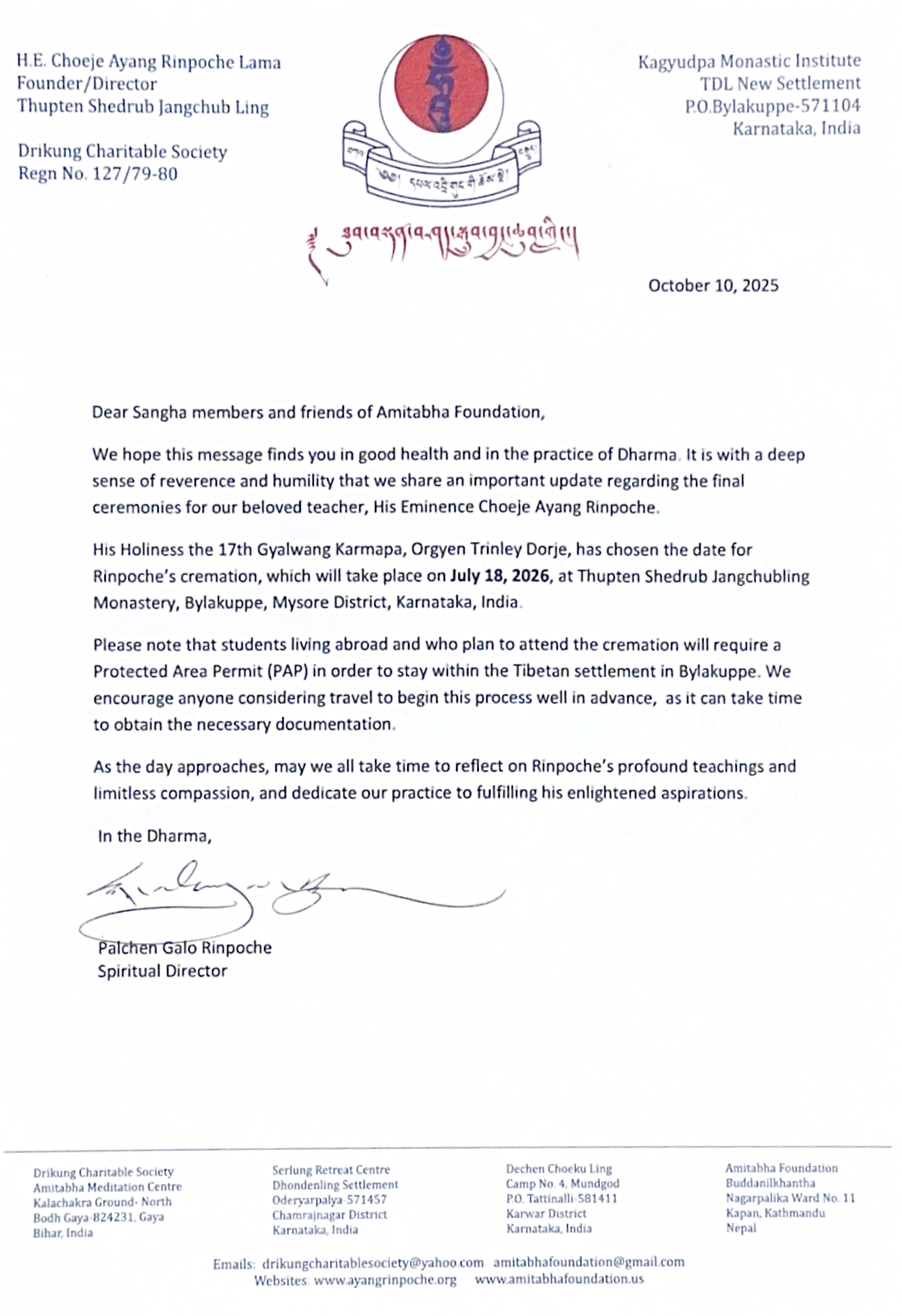 Sa Sainteté le 17e Gyalwang Karmapa, Orgyen Trinley Dorje, a choisi la date de la crémation de Rinpoché, qui aura lieu le 18 juillet 2026, au Monastère de Thupten Shedrub Jangchubling, Bylakuppe, district de Mysore, Karnataka, Inde.