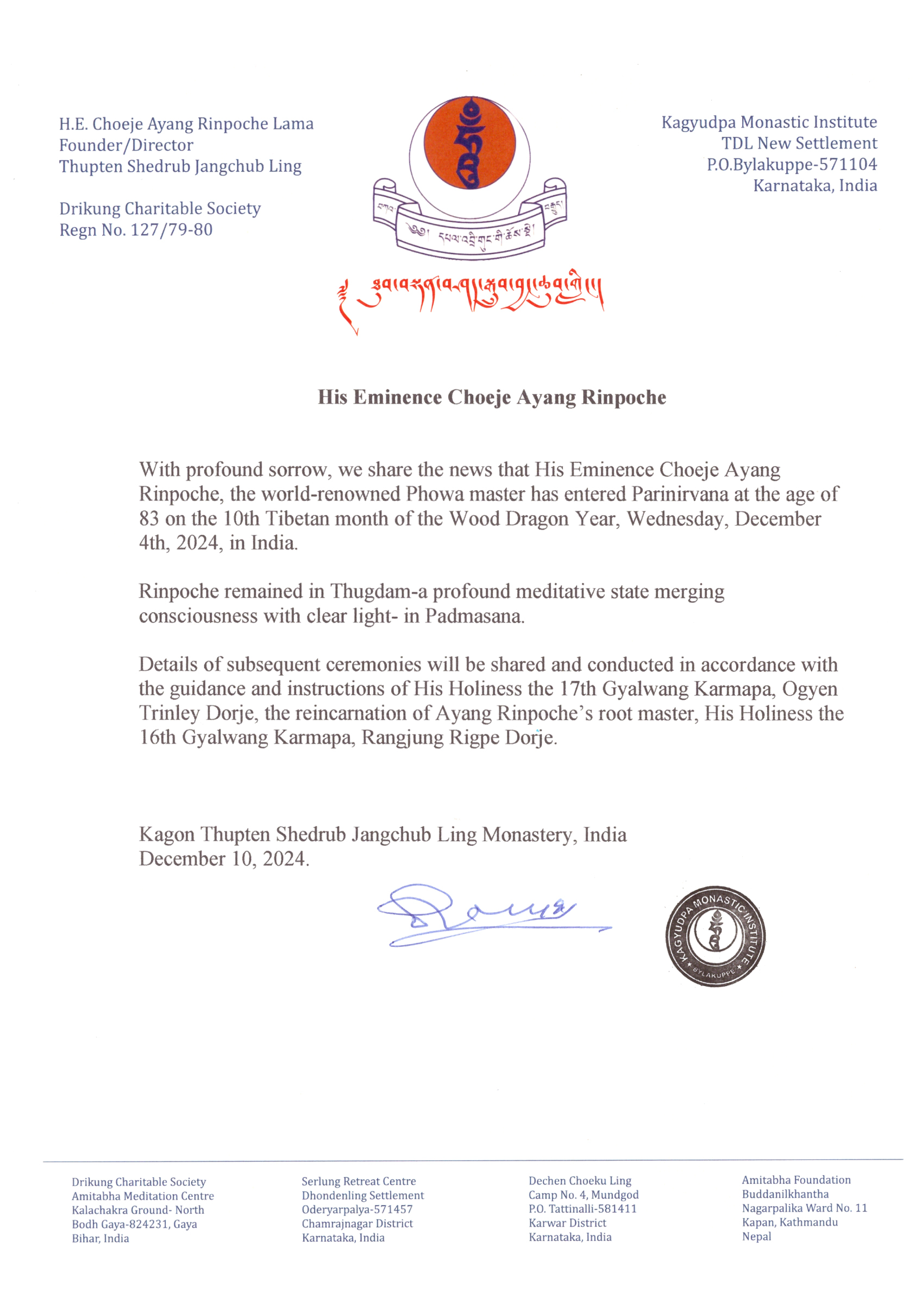 C'est avec une profonde tristesse que nous partageons la nouvelle que Son Éminence Choeje Ayang Rinpoché, le maître de Phowa de renommée mondiale, est entré dans le Parinirvana à l'âge de 83 ans, le 10e mois tibétain de l'année du dragon de bois, le mercredi  4 décembre 2024, en Inde.