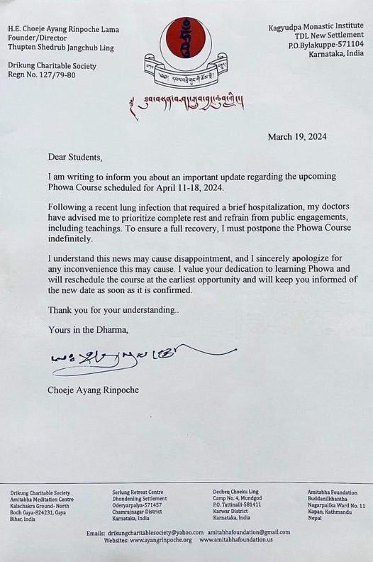 À la suite d'une récente infection pulmonaire qui a nécessité une brève hospitalisation, mes médecins m'ont conseillé de me reposer complètement et de m'abstenir de tout engagement public, y compris d'enseigner. Afin d'assurer un rétablissement complet, je dois reporter le cours Phowa pour une durée indéterminée.