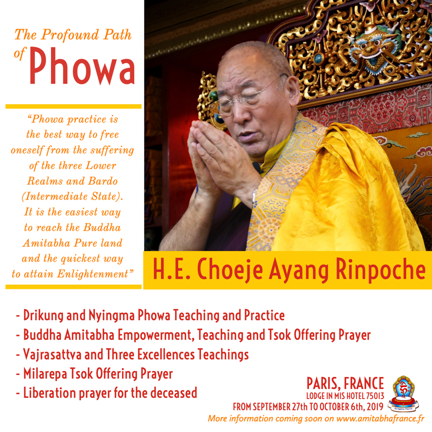 Cours de Phowa. Transfert de conscience au moment de la mort Paris, France Hôtel Lodge In MIS 2-16 Rue Théroigne de Mericourt. 75013 Paris Rinpoche enseigne en anglais, traduction en français assurée. La cérémonie de transmission orale du Phowa Nyingma ainsi que celle du Phowa Drikung seront ouvertes à tous. Les prières d'offrande de tsok au Bouddha Amitabha et à Milarépa ainsi que les enseignements de Vajrasattva et d'Amitabha seront également ouverts à tous. Merci de consulter le programme détaillé pour plus de précisions. Attention, quelques sessions sont réservées aux pratiquants qui vont recevoir en cette occasion (ou qui ont déjà reçu) la transmission des enseignements de Phowa de la part de SE Choeje Ayang Rinpoche. Les personnes qui ont terminé le Ngondro ou celles qui sont en train de le finir peuvent assister à ces sessions; les autres pratiquants devront s'engager à réciter des mantras s'ils souhaitant recevoir les enseignements de Phowa. Rinpoché l'expliquera au début de l’enseignement. Si vous avez prévu de pratiquer le Phowa, Rinpoche conseille fortement d’assister au stage en entier, tout particulièrement si vous assistez à ses enseignements de Phowa pour la première fois. Vous êtes cordialement invité à vous inscrire dès maintenant afin de vous assurer une place. Vous pouvez vous inscrire en ligne, ou télécharger le formulaire d'inscription papier. Les difficultés financières ne doivent pas faire obstacle à la pratique du Dharma; si vous êtes dans cette situation, merci de bien vouloir nous contacter avant l’inscription. D'autre part, vous êtes invité à adhérer à l’association si vous avez prévu de participer aux pratiques organisées dans le centre dans le courant de l’année ou si vous souhaitez apporter votre soutien à l’existence de l’association et à la réalisation de ses projets (lien au formulaire ci-après). Nous espérons vivement avoir le plaisir de vous retrouver lors des enseignements. Phowa course Transference of Consciousness at the Time of Death Paris, France Hotel Lodge In MIS 2-16 Rue Théroigne de Mericourt. 75013 Paris Rinpoche will teach in English, with French translation provided. Several sessions will be open to allow the greatest number to receive the Drikung and Nyingma oral transmissions. Likewise, both Amitabha and Milarepa tsok offerings and the Vajrasattva and Amitabha teachings will be open to all. Please, check the program for details. Notice that some sessions are reserved only for the practitioners who will receive in this course (or have already received) the Phowa teachings from H.E. Choeje Ayang Rinpoche. If you plan to practice Phowa, Rinpoche strongly advises to attend the course in full, especially if you will attend his Phowa course for the first time. Those who have completed the Ngondro or are doing it can receive the Phowa teachings. Others students will require to make a commitment to recite mantras. Rinpoche will explain this at the beginning of the course. Registration is strongly recommended to reserve your space. Here below the link to the registration form. Financial difficulties must not hinder your practice; if you are in this situation, please let us know. On the other hand, you are invited to join the association if you wish to support its existence and its projects (link to the form below). We look forward to your participation! Si vous souhaitez séjourner au Lodge In MIS, profitez d'une rémise de 20% avec le code AMITABHA sur l'ensemble de la réservation web appliquée à l'étape "Réservez" (hors extras). Chambres pour 1 à 6 personnes. Save 20% off on your Lodge In MIS e-booking using the promo code AMITABHA Discount apply at the step "Book!" (excluding extras). Rooms for 1 to 6 people. Try a phone call if no availability online, CIS hotels had rooms available (internet booking was temporarily suspended) Hébergement chez l'habitant 75013 (accomodation with host family) AIRBNB 75013 Se déplacer à Paris Getting around in Paris