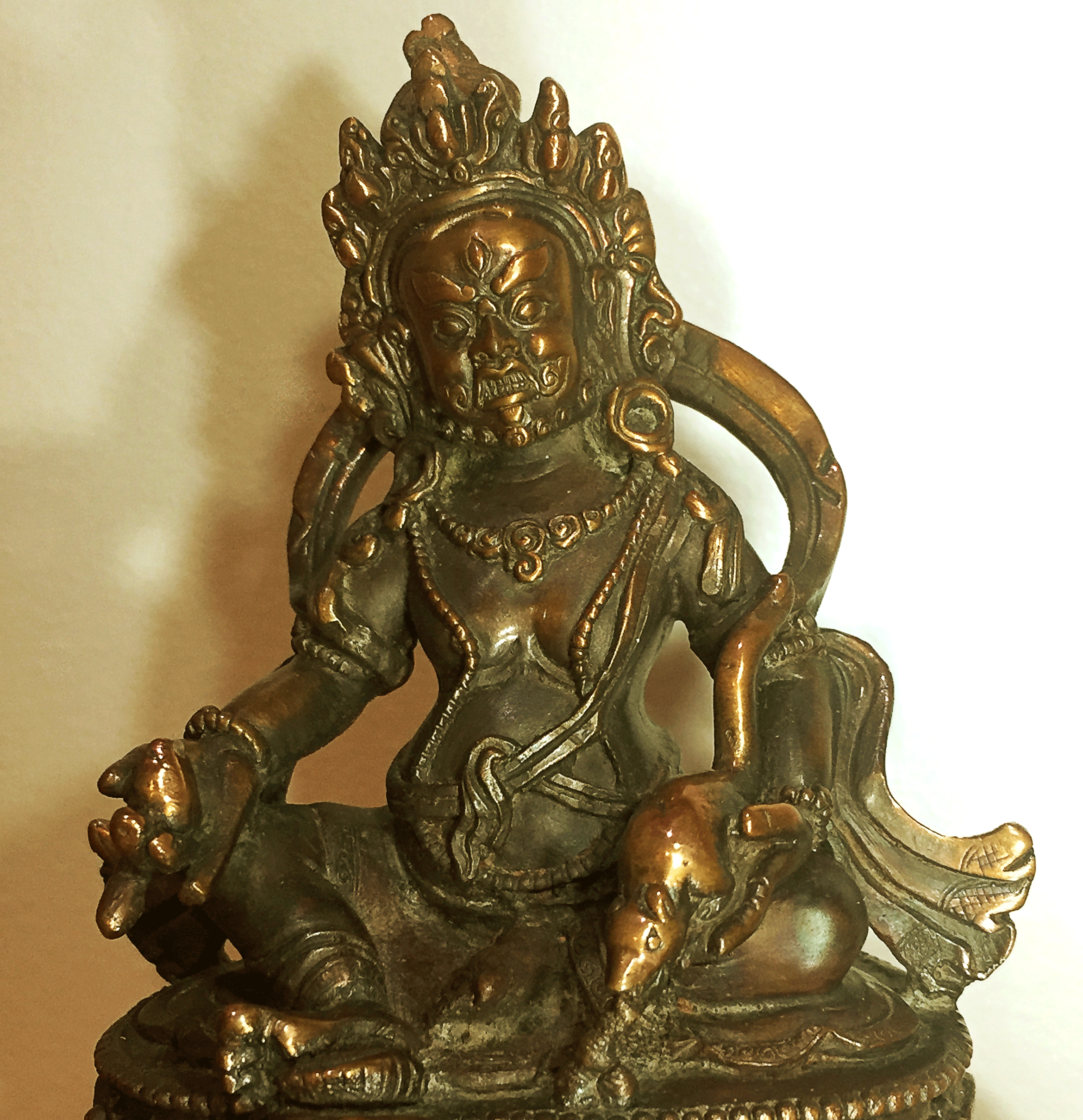 Dzambhala est une émanation de Ratnasambhava, l'une des cinq familles de Bouddhas dont l'activité éclairée augmente la prospérité et dont l'essence est la générosité.