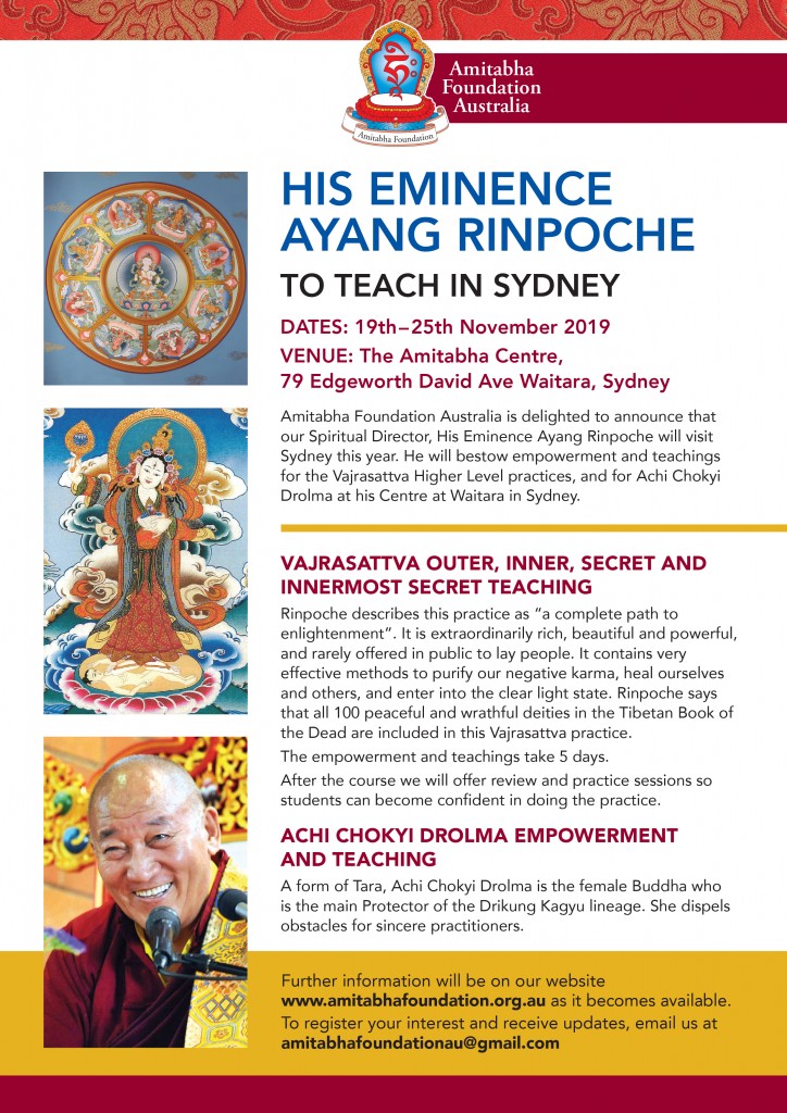 The Amitabha Foundation Australia is delighted to announce that our Spiritual Director, His Eminence Ayang Rinpoche will visit Australia this year. He will bestow empowerments and teachings for the Vajrasattva Higher Level practices, and for Achi Chokyi Drolma at his centre at Waitara in Sidney.